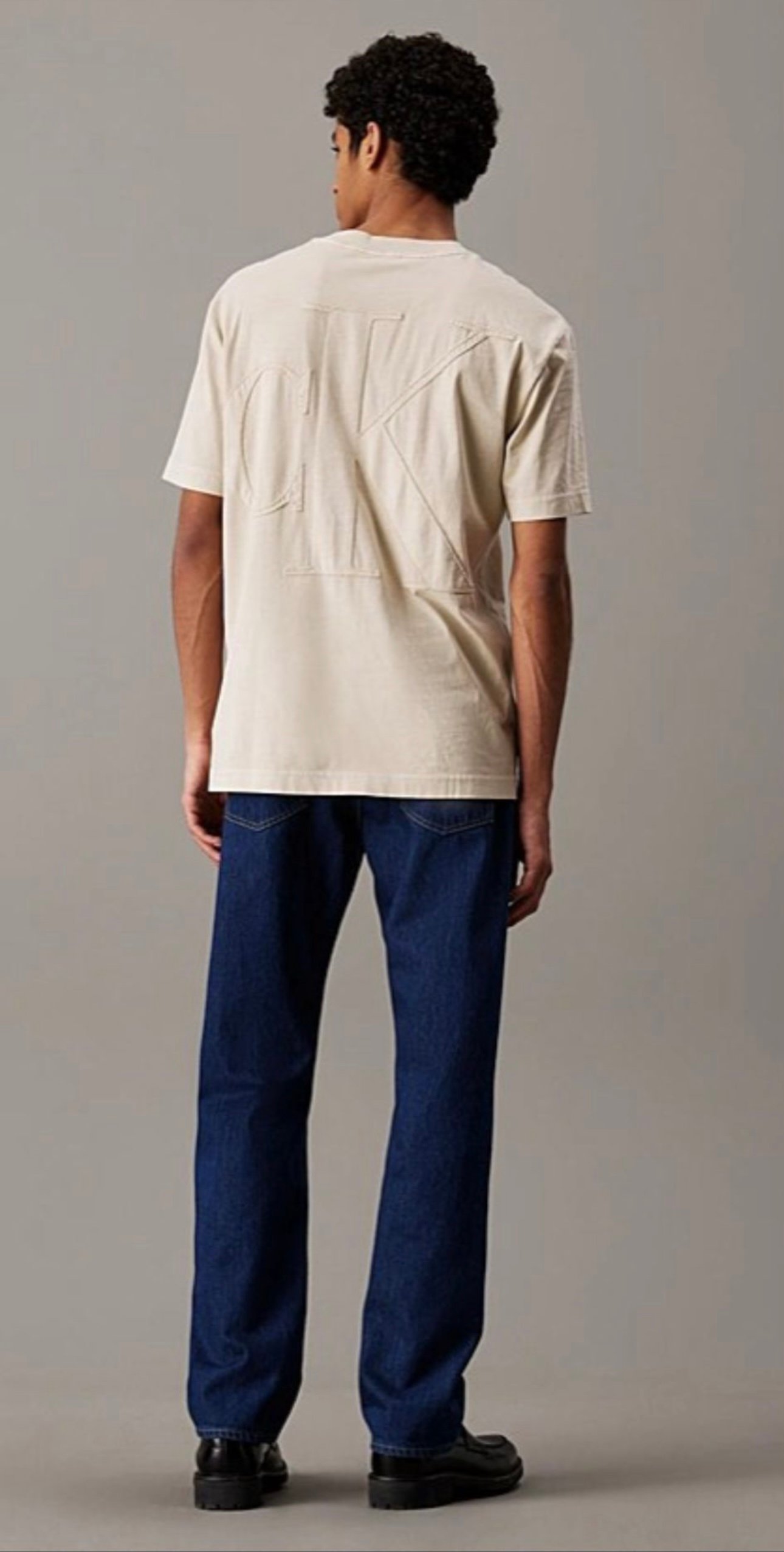 טי-שירט בצבע בז' עם לוגו CK גדול בגב – שילוב מושלם בין מראה נקי לסטייל בולט.