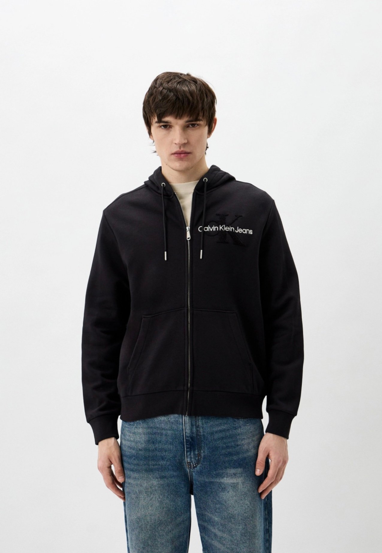 קפוצ’ון רוכסן שחור מבית Calvin Klein Jeans בעיצוב נקי עם לוגו אייקוני – שילוב מושלם של נוחות, סטייל ואורבניות מודרנית.