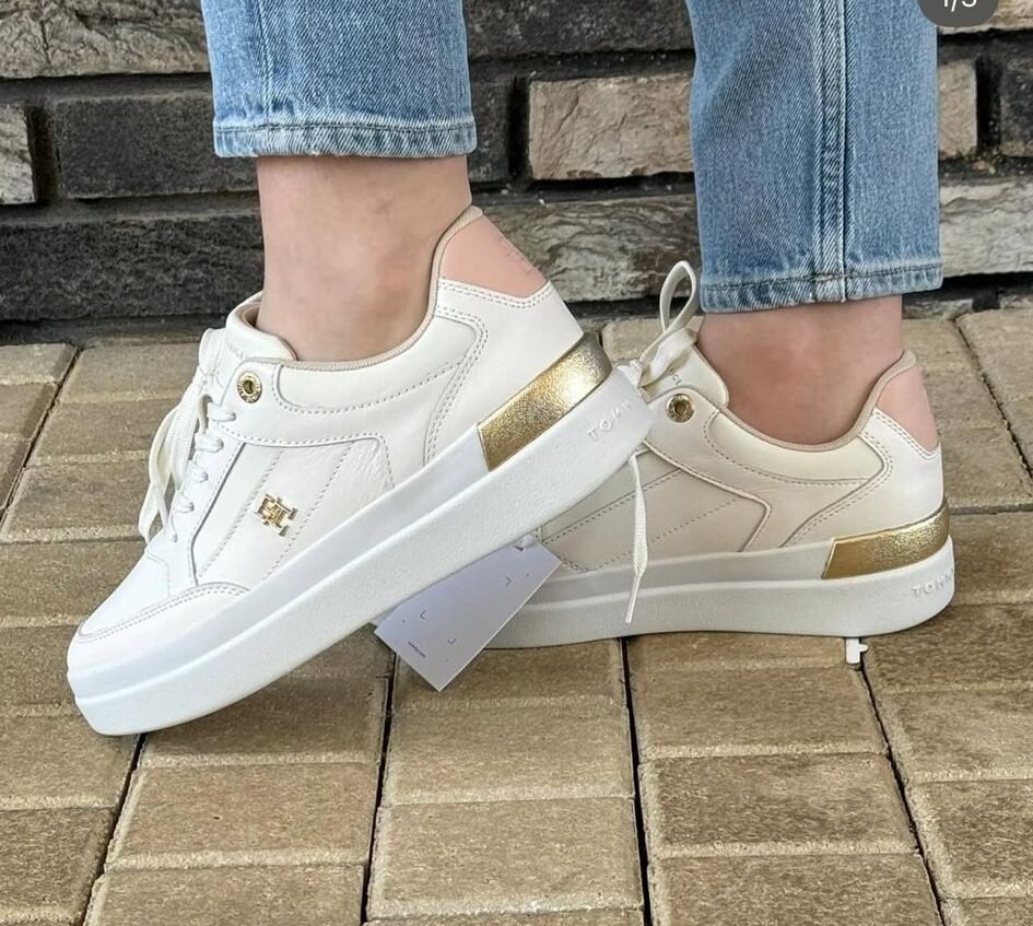 סניקרס פלטפורמה מבית Tommy Hilfiger בעיצוב נקי ואלגנטי עם טאץ’ יוקרתי של גימורי זהב – שילוב מושלם בין נוחות יומיומית לסטייל אופנתי.