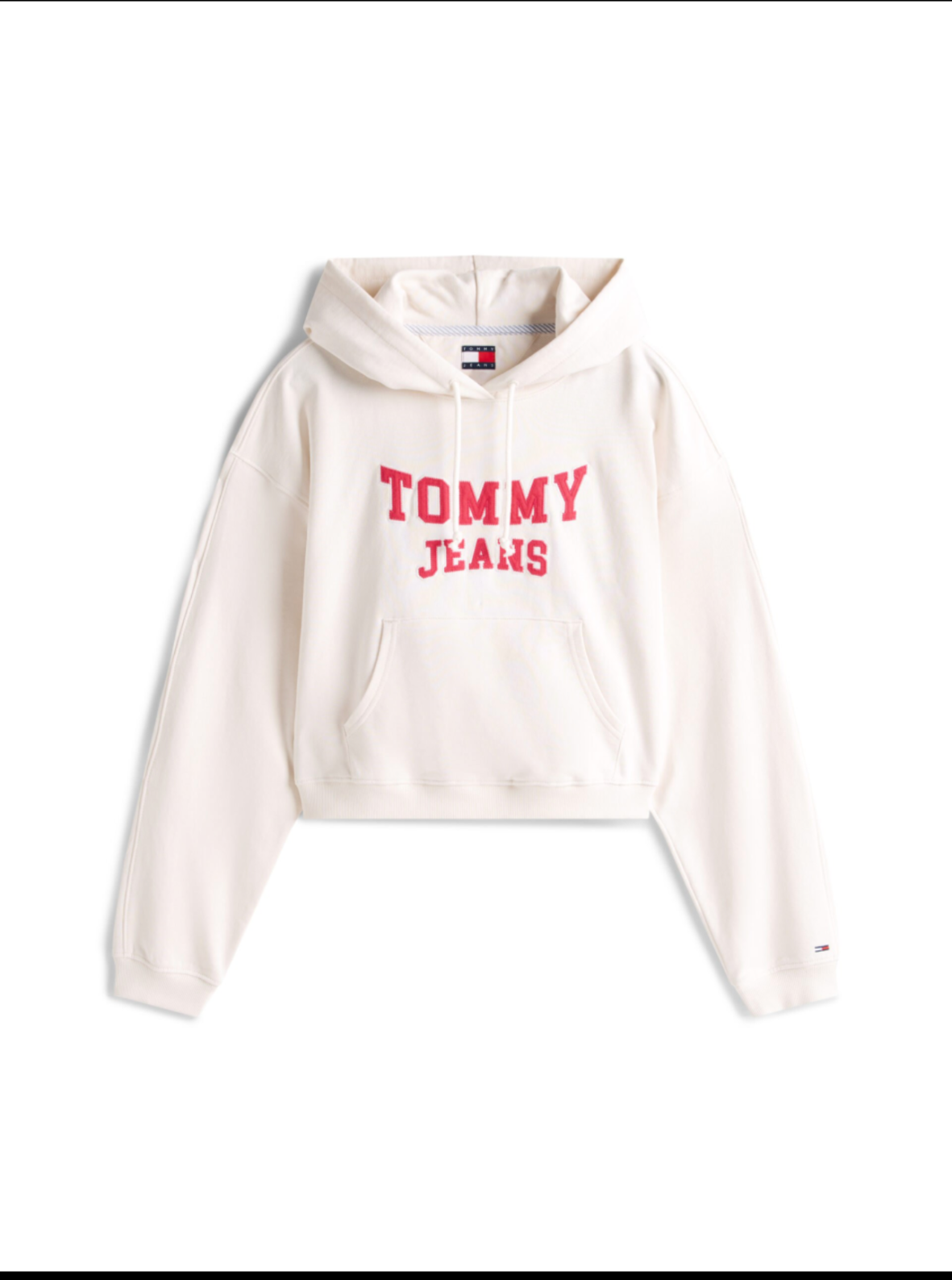 סווטשירט קפוצ’ון קצר מבית TOMMY JEANS בגוון אוף-וייט, עם לוגו מודפס אדום בעיצוב קלאסי וסטייל אורבני עדכני.