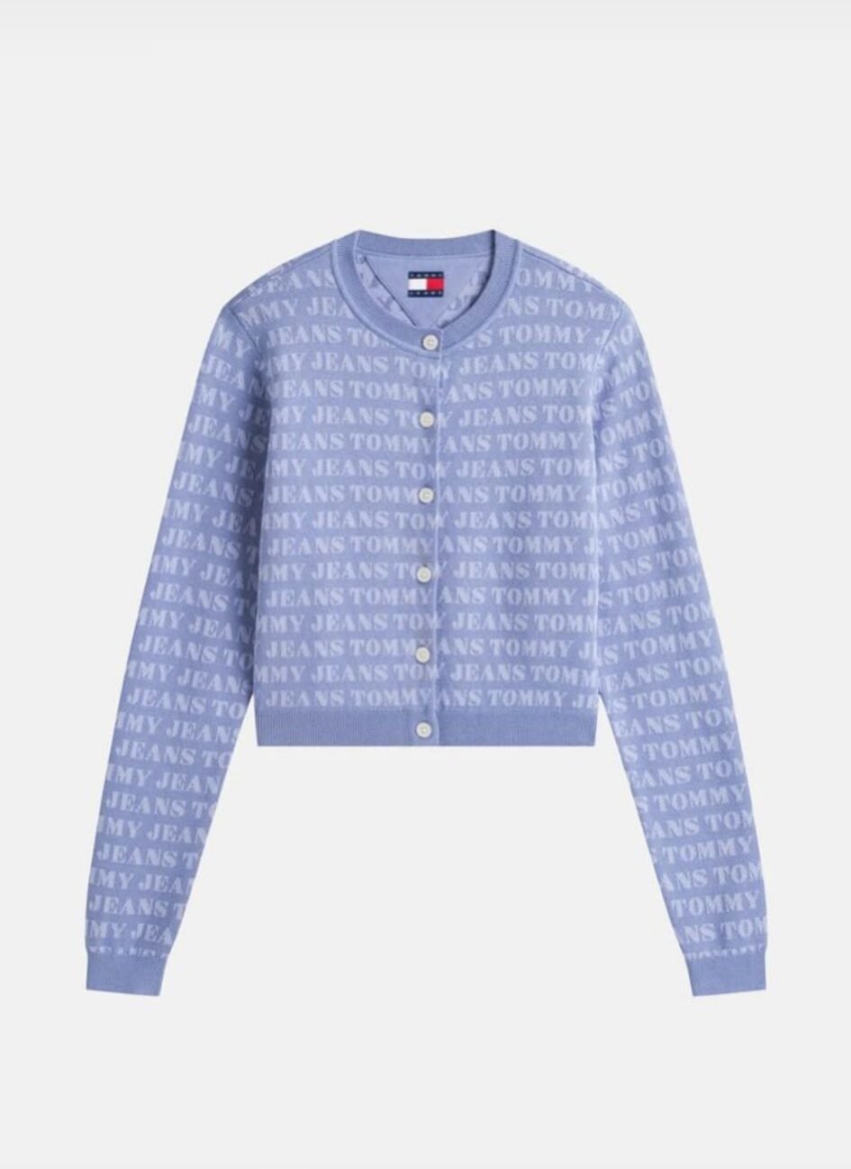 Tommy Jeans Monogram Sky Cardigan מעוצב בגוון כחול שמיים רך ומרענן, עם הדפס לוגו חוזר שמעניק מראה ייחודי אך אלגנטי.