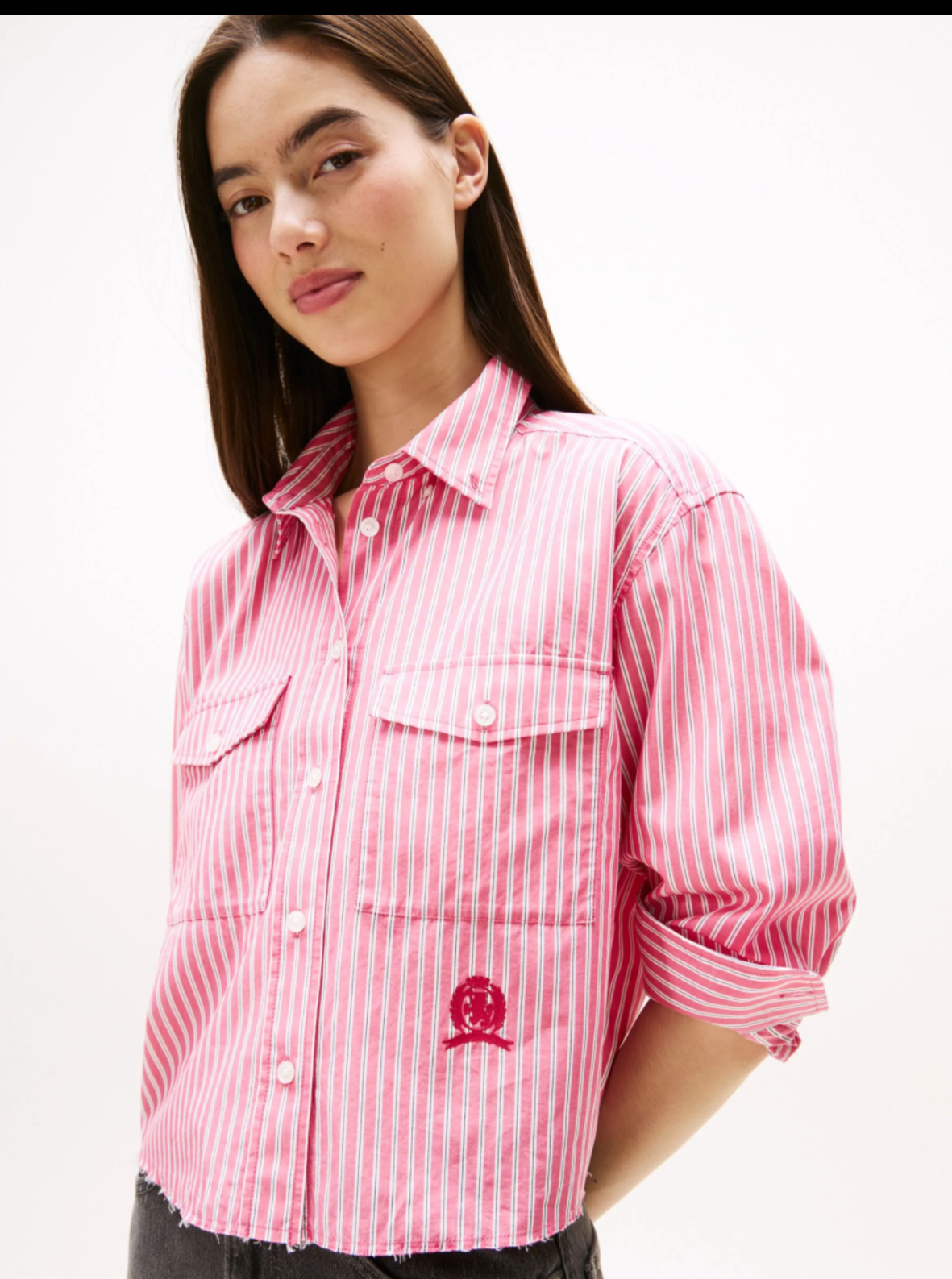 חולצה מכופתרת לנשים מבית Tommy Jeans בעיצוב פסים ורוד קלאסי, שמוסיפה טאץ׳ נשי ורענן לכל לוק יומיומי.