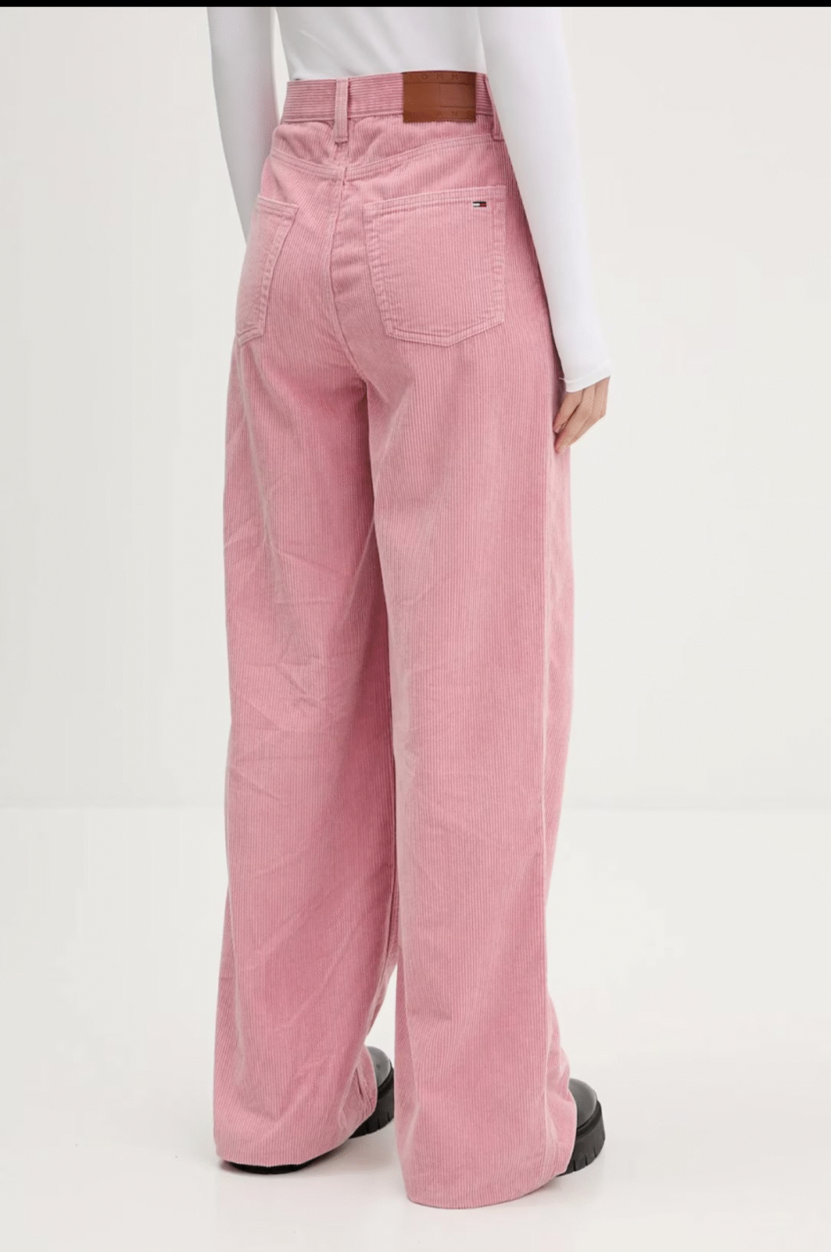 מכנסי קורדרוי רחבים מבית TOMMY JEANS בגוון ורוד רך, בגזרה גבוהה ומחמיאה, לסטייל אורבני נשי עם אמירה אופנתית.